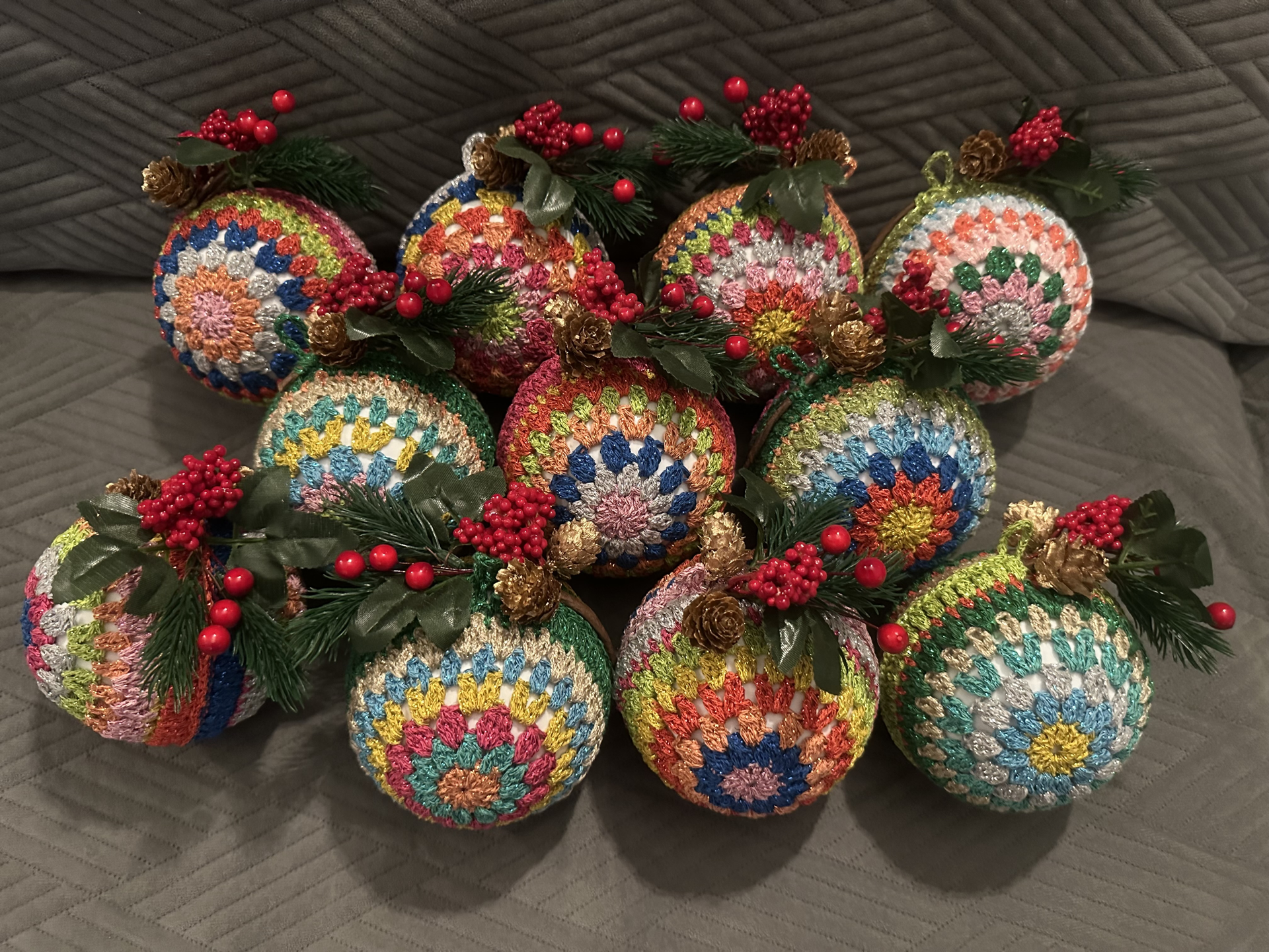 К празднованию Синтерклааса в клубе мы договорились сделать подарочки друг другу. Таким образом, мне нужно было сделать 11 подарков для всех членов клуба. Я решила связать ёлочные шарики, добавила к ним коробочку с печеньем и персональное стихотворение. Получилось очень стильно, и мои дамы были довольны.