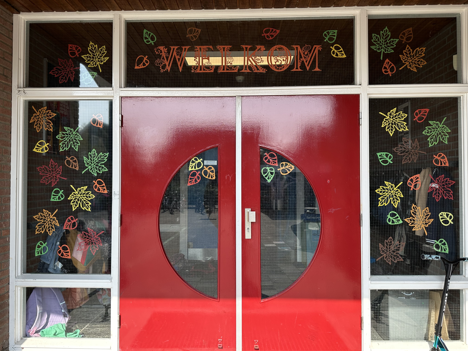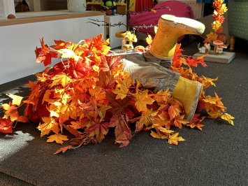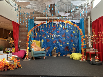 Украсила входы в школу и подиум в осенней тематике. А в холле у малышей к теме подводного мира висит шикарный осьминог.