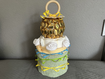 В подарки для новорожденных малышей сделала три тортика из памперсов и две соски-пустышки из конфет.