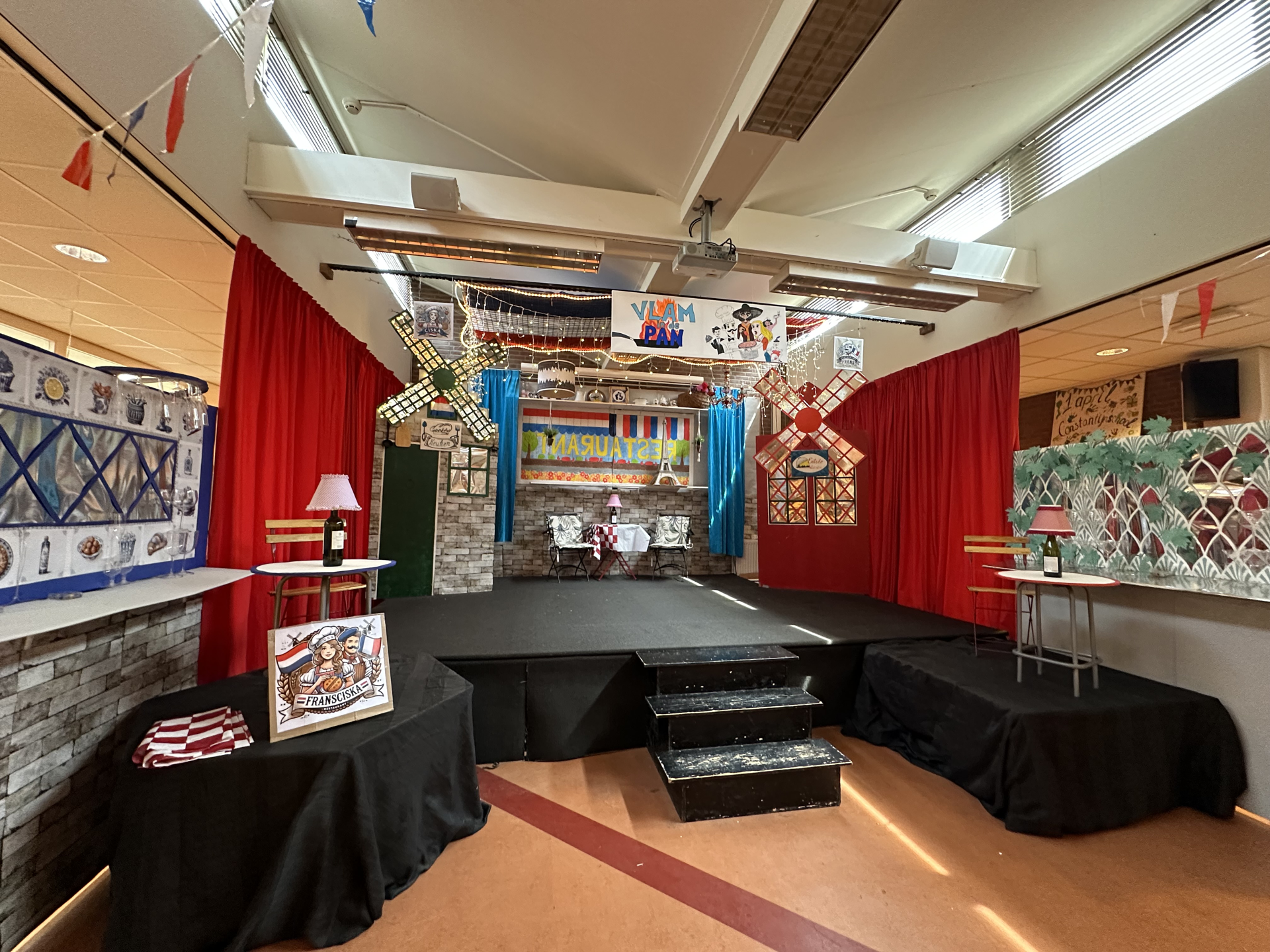 Заканчиваю оформление сцены к выпускному школьному мюзиклу “Flam in de pan”. В этот раз на сцене должна быть атмосфера ресторана, поделённого на две части – Голландскую кухню и Французскую.