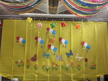For the King’s birthday, the stage was decorated with paper cutouts and balloons.