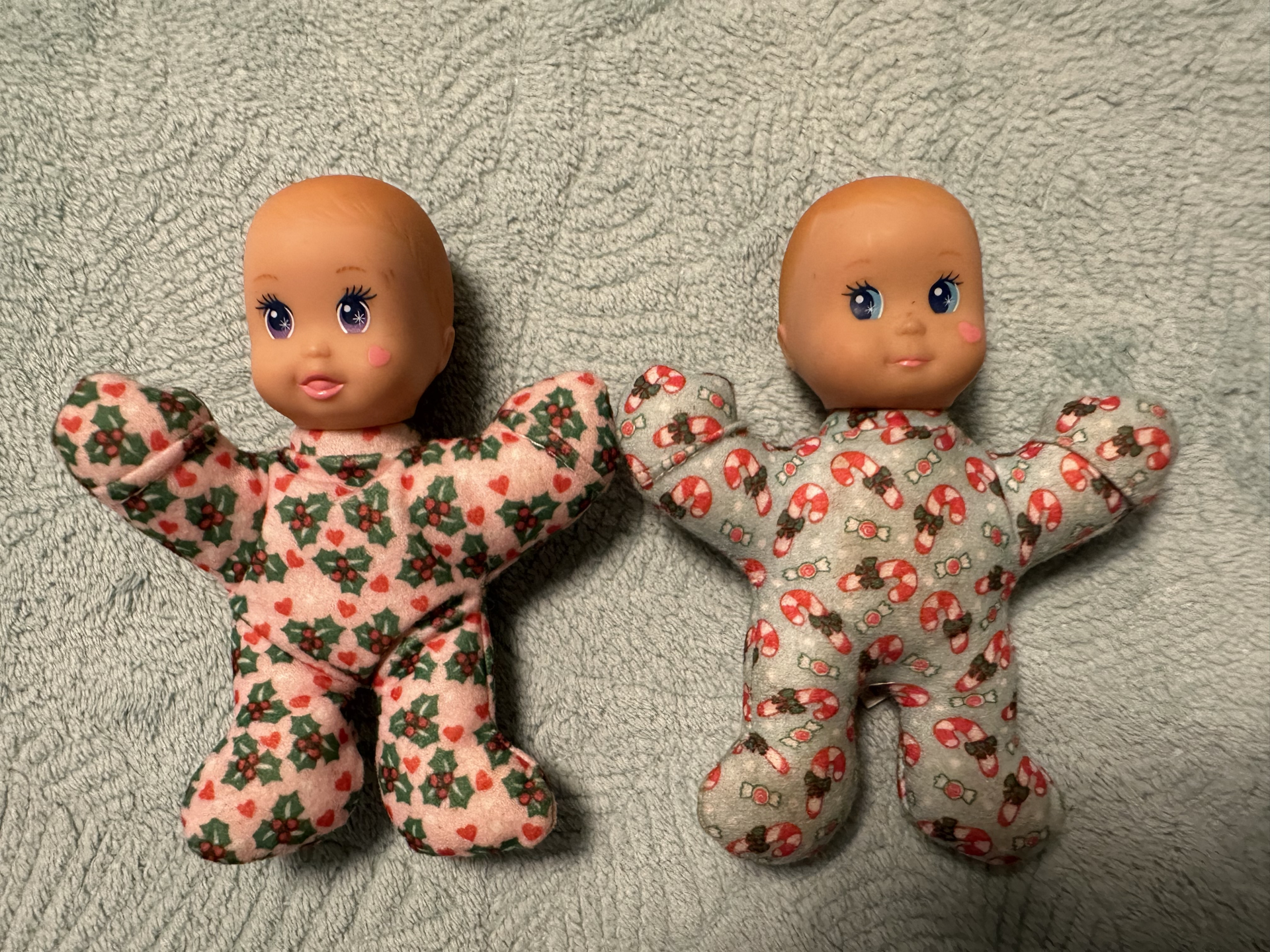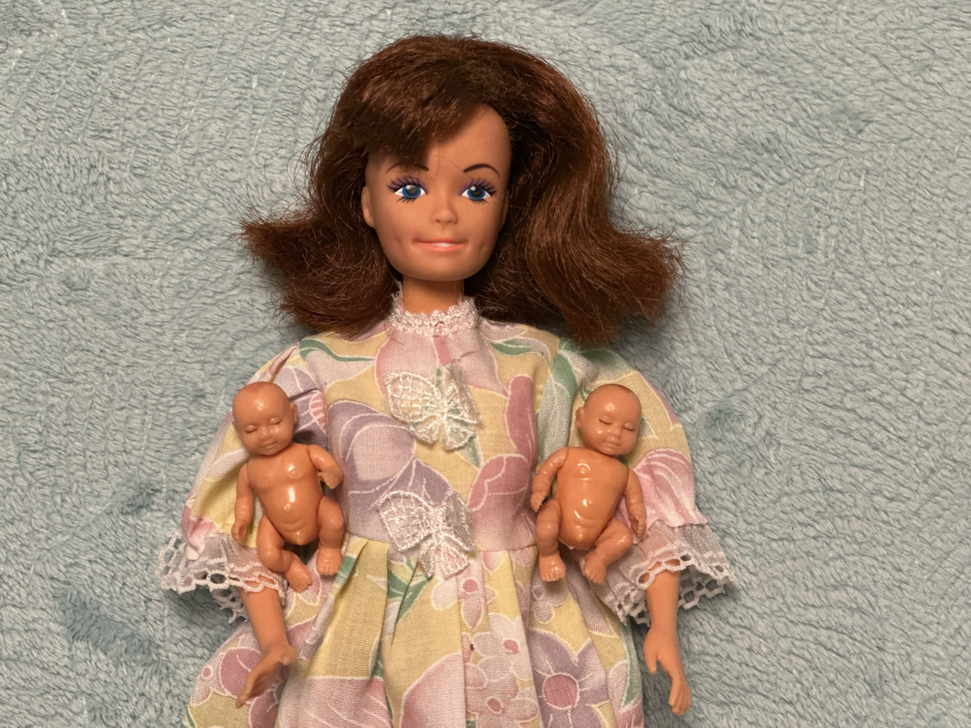 Today at the charity fair, I bought two dolls for two euros – Expectant mommy 1993 from the company Lucky. Куколка беременная двойней артикуляционных мальчиков. The doll’s arms spread apart, and its legs are made of vinyl and bend. The face is very sweet, but the hair is severely damaged and cut short. I couldn’t identify the second Steffi Love from Simba anymore precisely. The handles are straight and don’t spread apart, the legs are made of vinyl and fold in two clicks. The hair is also severely damaged and cut.