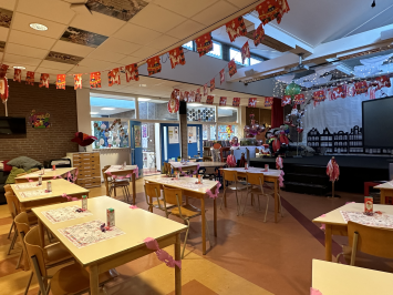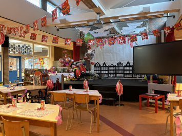 For our pregnant colleague, expecting a girl, we threw a party at school. And for this, it was necessary to slightly change the decor in the main hall and on the podium.