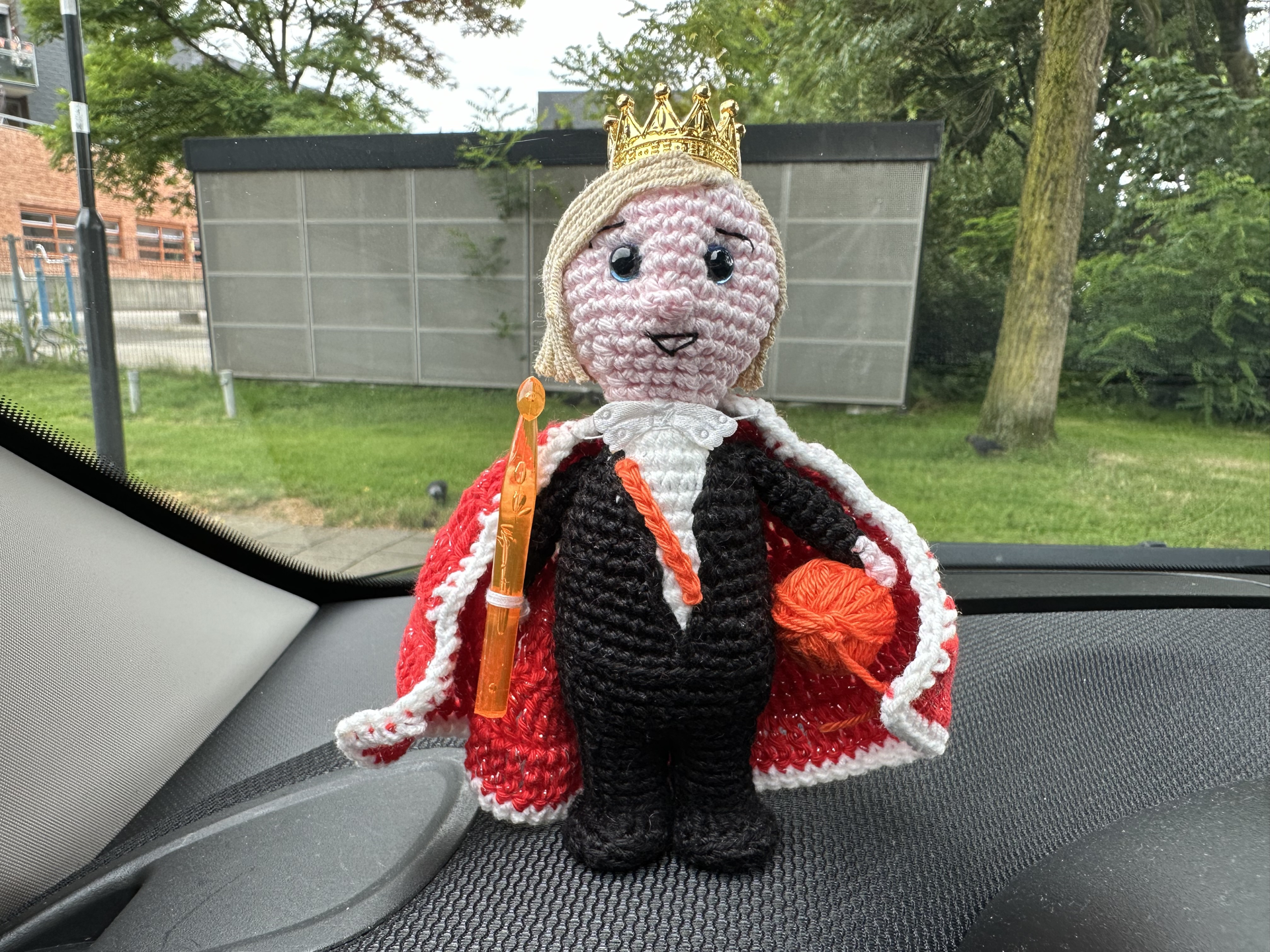 Today I had a life-changing event. Circumstances arose such that I had the honor of speaking with His Royal Highness Willem-Alexander, King of the Netherlands. He came for a visit to Woerden, visited several locations, and at the end, visited our crocheting club as well. I couldn’t resist the opportunity and crocheted him a small figurine of a king with a knitting hook and a ball of yarn as a keepsake of this event. His Highness greeted each of us personally, taking each of our hands. He even stood with the mayor of the city while we sat, because we were placed in a very small side room, and the press didn’t even fit in there. The king said that my gift was very nice and asked me a few questions about my arrival in the Netherlands and how the club helps me improve my Dutch. His Highness is very pleasant to talk to and not at all arrogant! I still can’t believe this happened to me. None of my Dutch acquaintances have had the honor of speaking with the King, and I am so fortunate! And I am glad that somewhere in the palace collection now lies the small Willem Alexander that I crocheted.