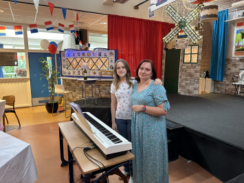 Today we have a gala performance by the group 8 for parents. Therefore, not only the runway is decorated, but also the entrance to the school and the entire hall has been transformed into a restaurant. We even have candles and live music. We invited Mariya to play some pleasant pieces on the electronic piano while guests arrive and settle at their tables.