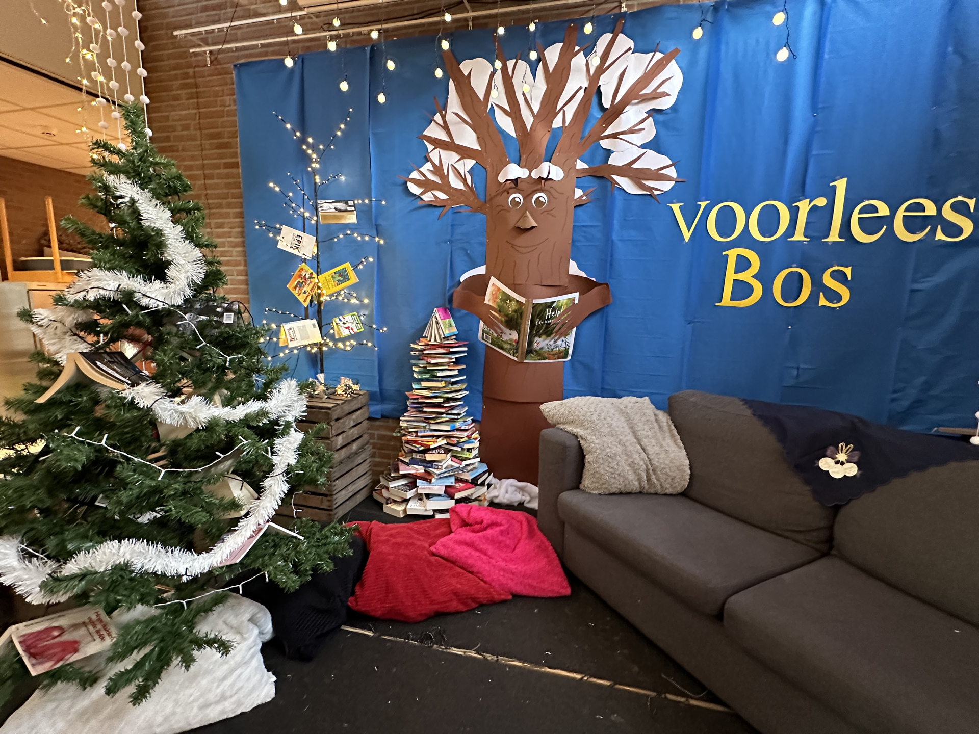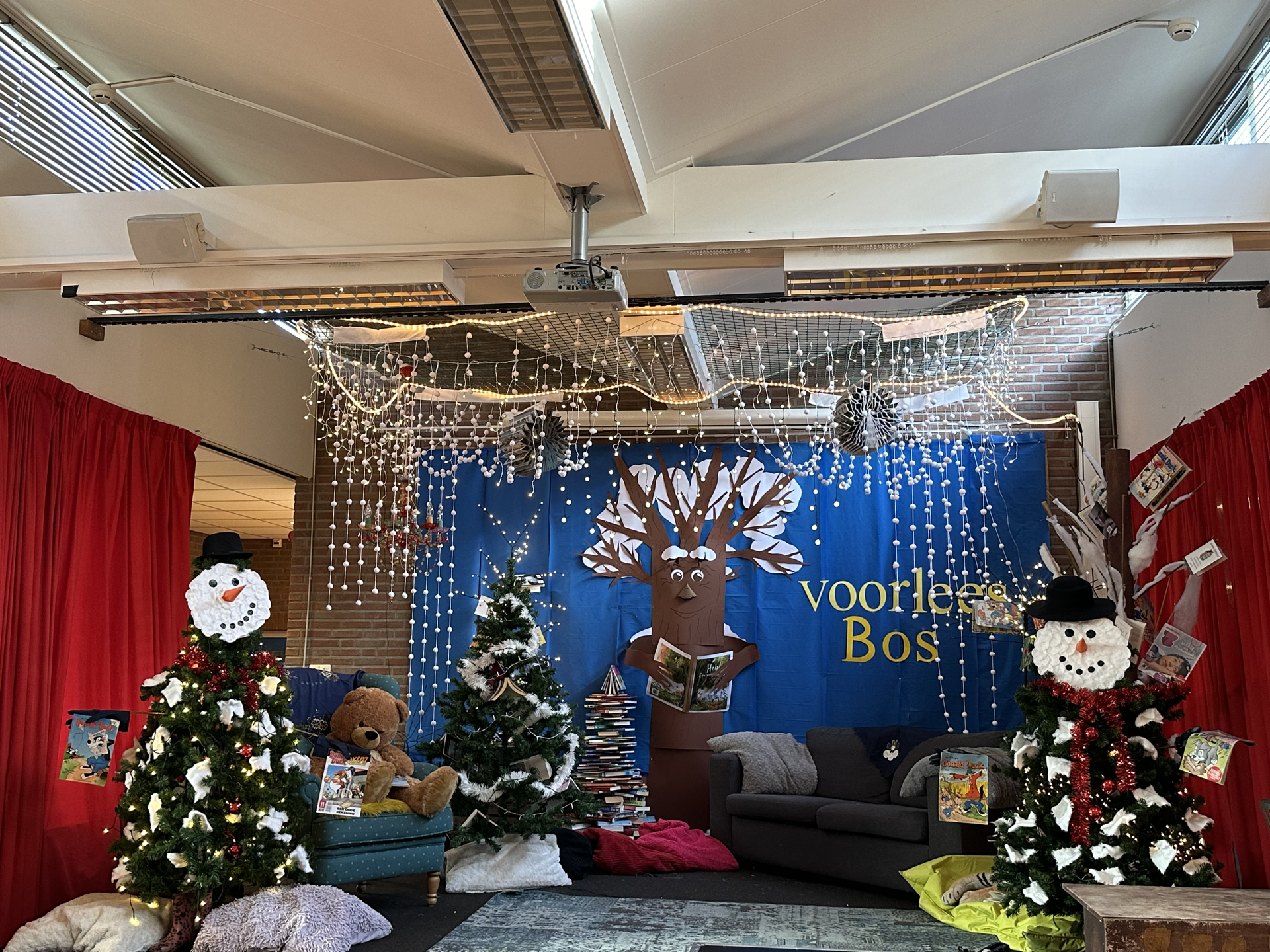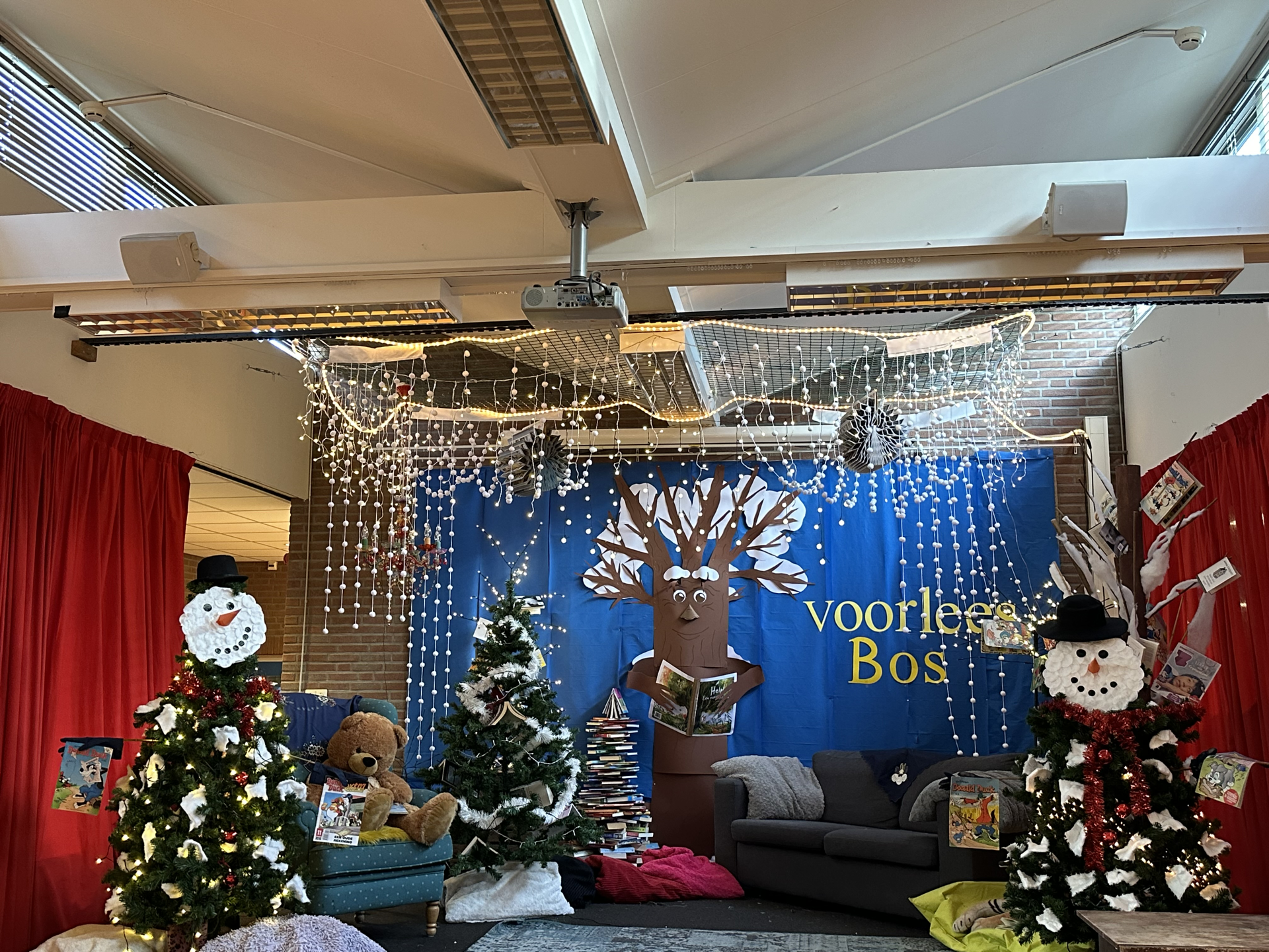 Voor de leesweek op school heb ik op een podium een sprookjesachtig winterse leesbos ingericht.