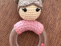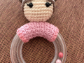Барашку я связала для сыночка коллеги мужа. В основе — деревянное кольцо, в голове звенящий шарик, в ручках и ножках деревянные бусины. Игрушку можно цеплять на пластиковый подвес от старой Аниной погремушки.