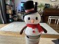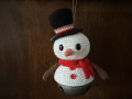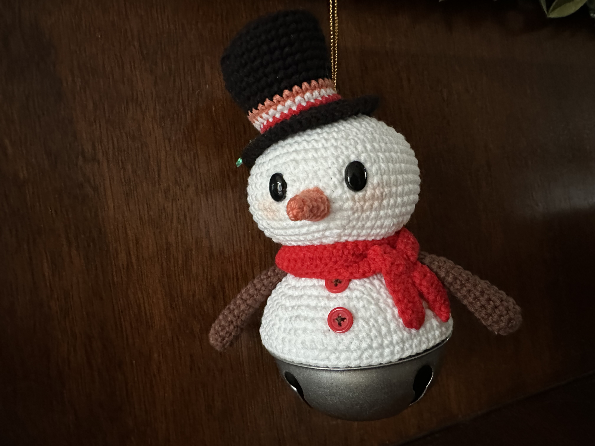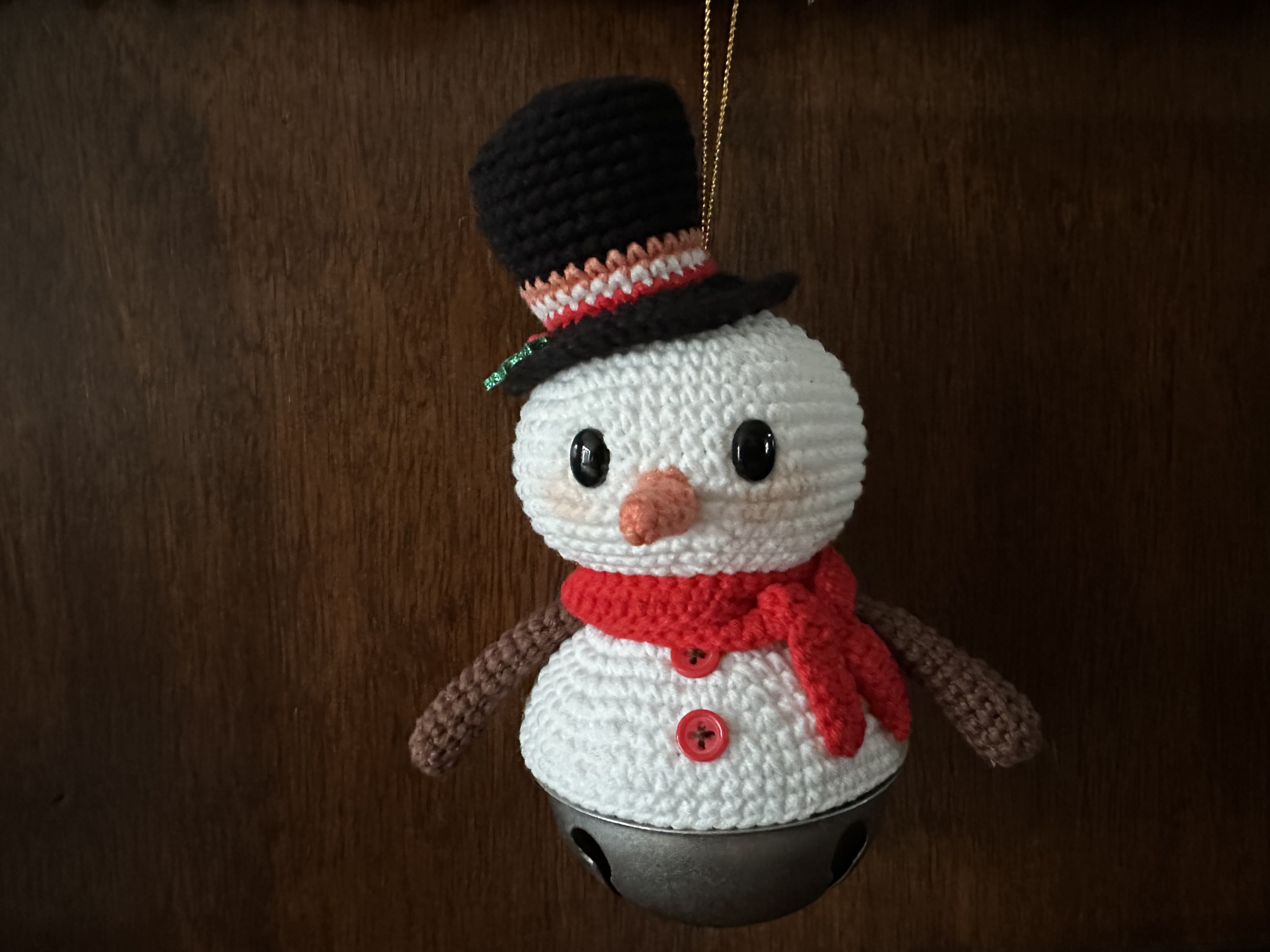 По описанию из книги связала ёлочную игрушку снеговика на бубенчике.