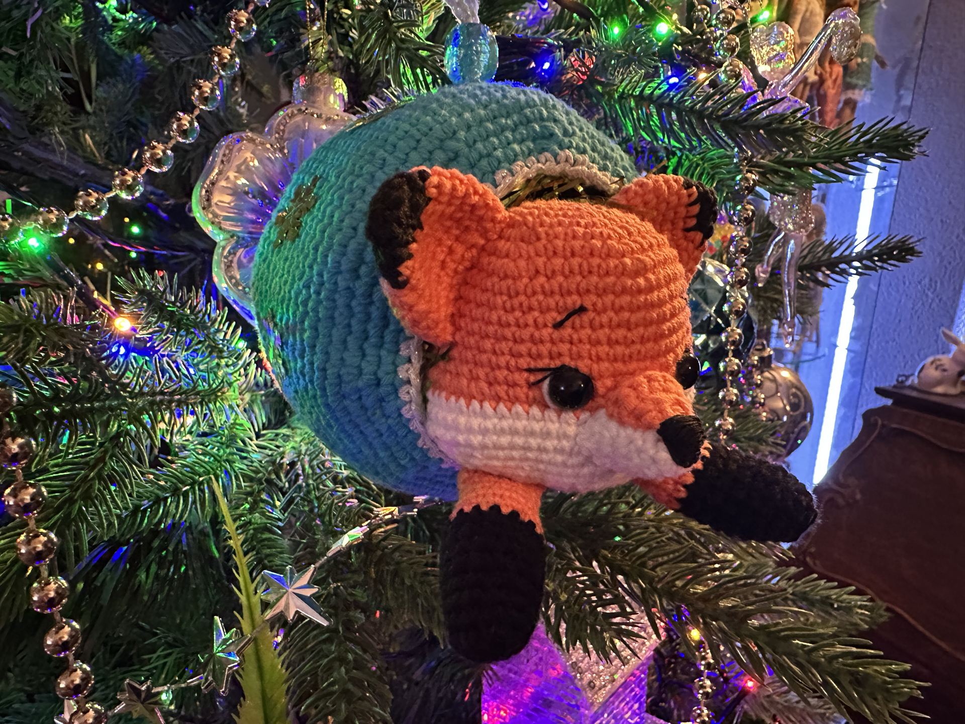 По описанию из журнала по вязанию связала ёлочную игрушку в виде шарика с лисёнком внутри.