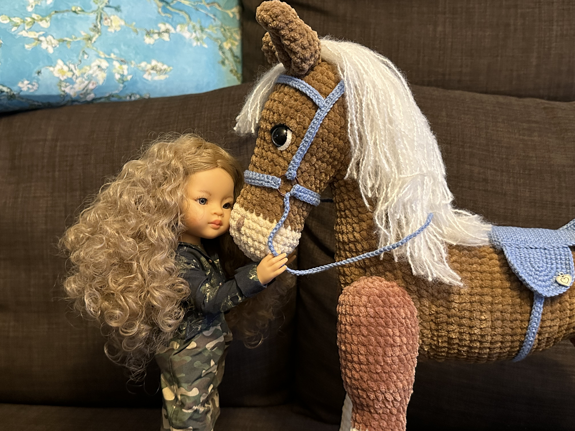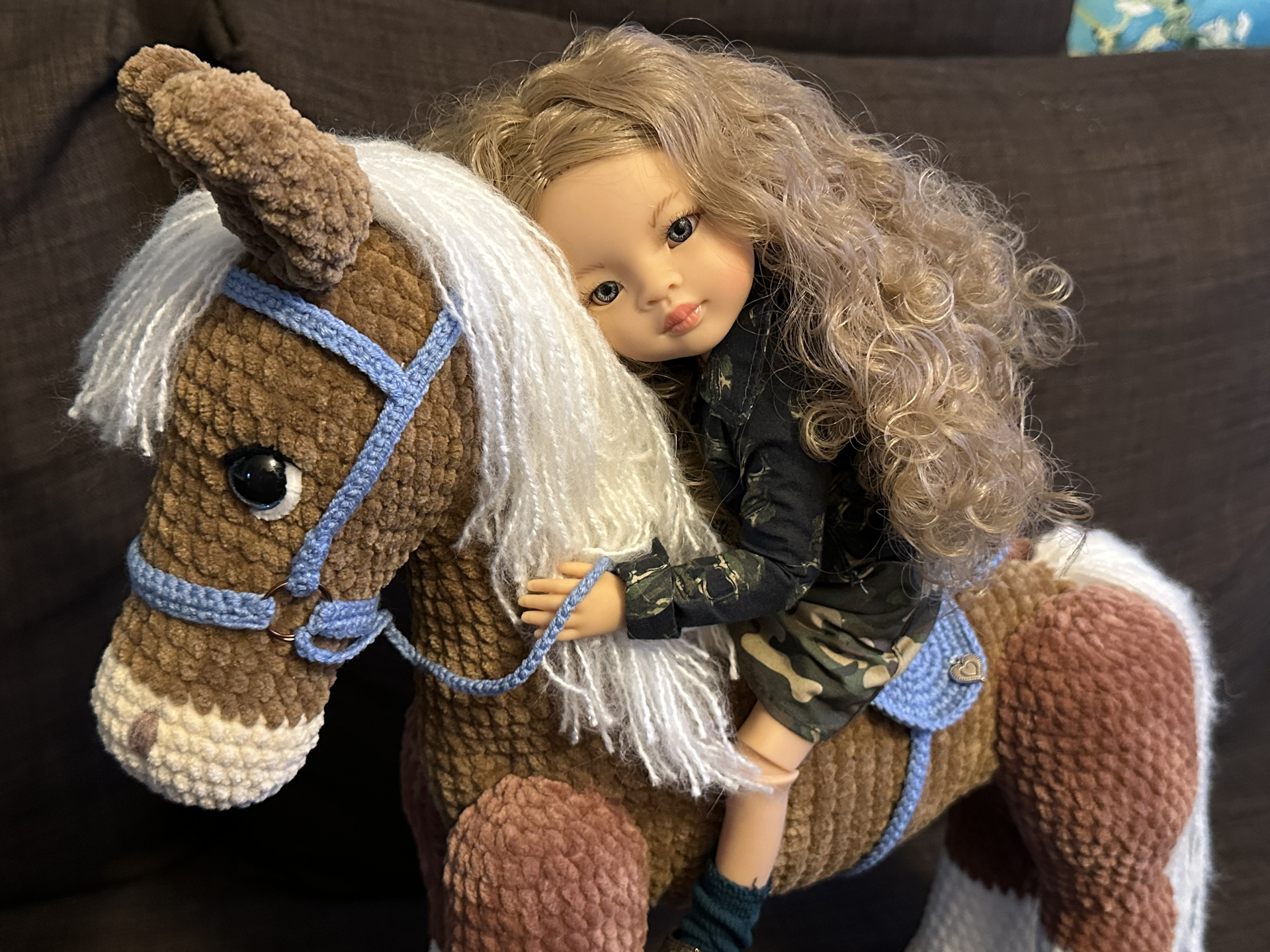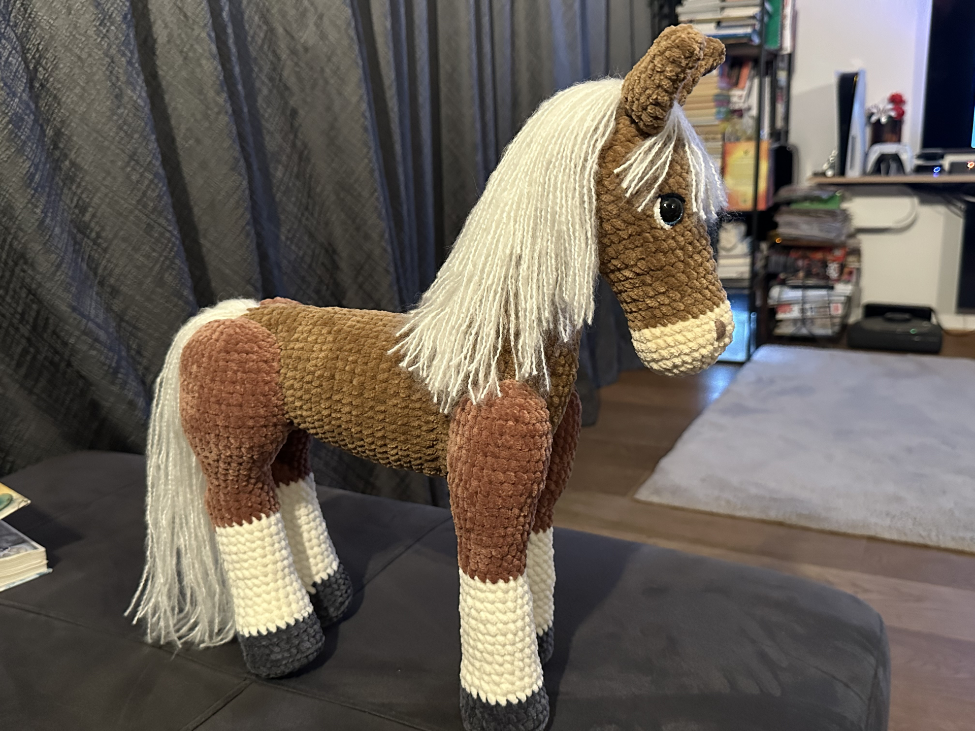 Связан из толстой велюровой пряжи по описанию из книги «Пони амигуруми» Кристел Дроог-Деккерс.