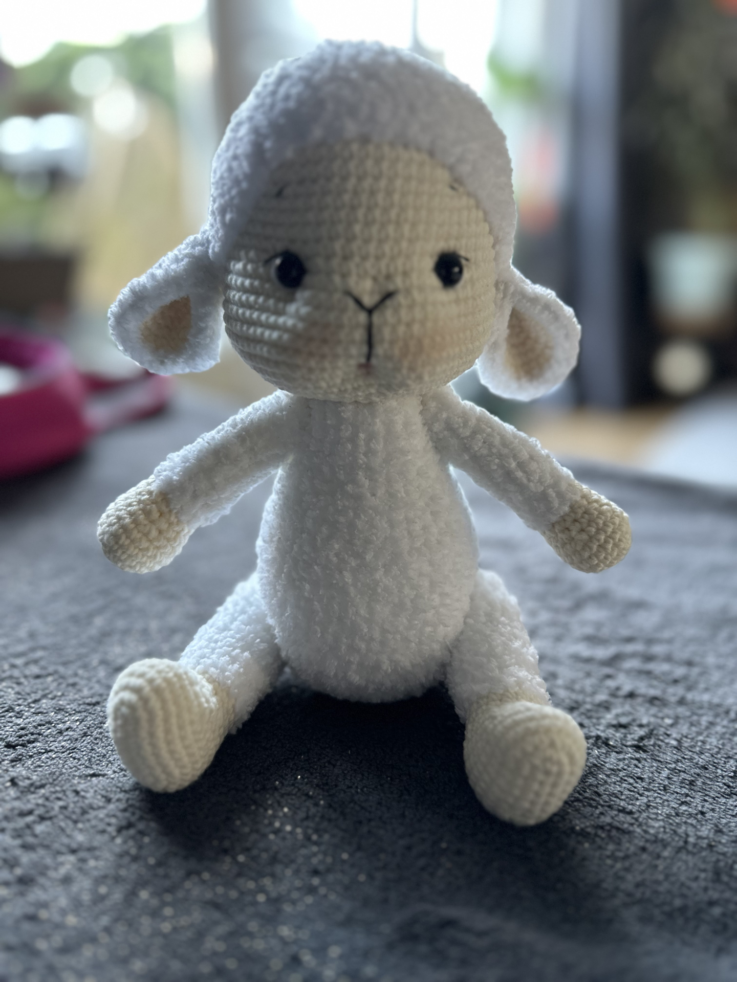 Связала из пушистой пряжи вельвет славную овечку для крёстной, ножки из проволочного каркаса, глазки безопасного крепления.