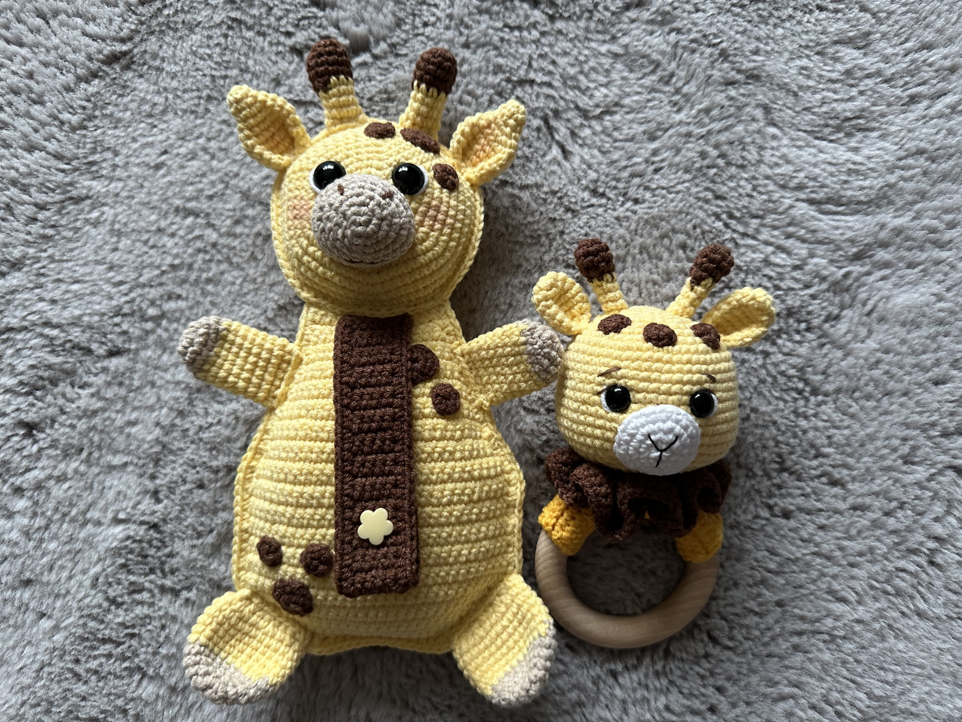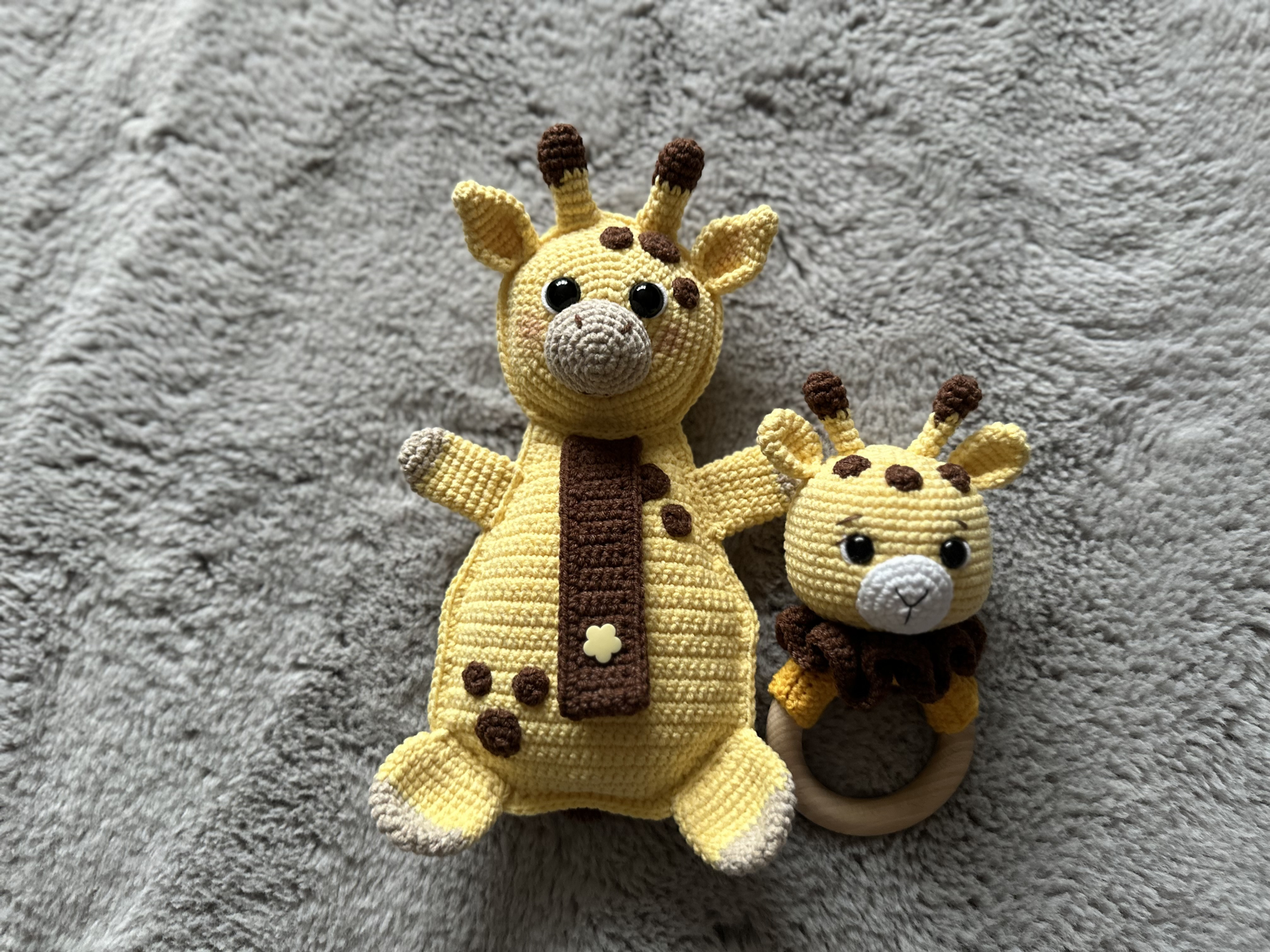 По онлайн описанию из связала ещё и погремушку в комплект к большому жирафу.