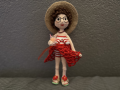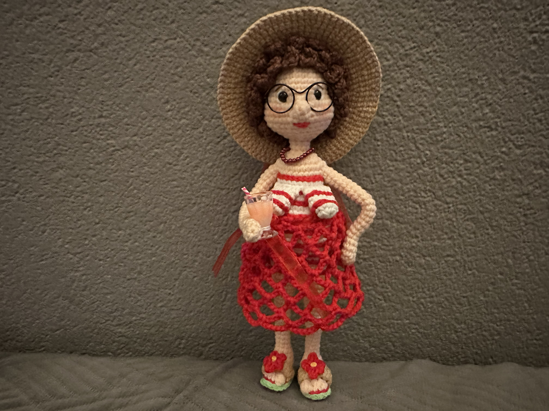 Эту куколку я связала в подарок на 50-летие своей подруге. Куколка получилось даже похожа на нее. Связана она из х/б ниток, волосы и платье из Ализе. Кукле я пошила кружевное белье, сделала босоножки и ленту победительницы конкурса красоты. На голове корона, в ушах серьги-подвески, в руках букет цветов. Красавицу я упаковала в коробку с моим логотипом.