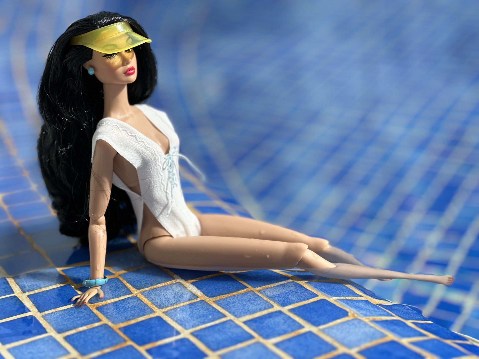 Пошила для Poppy Parker білий купальник і зробила кілька фото з моделлю в басейні.