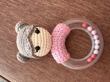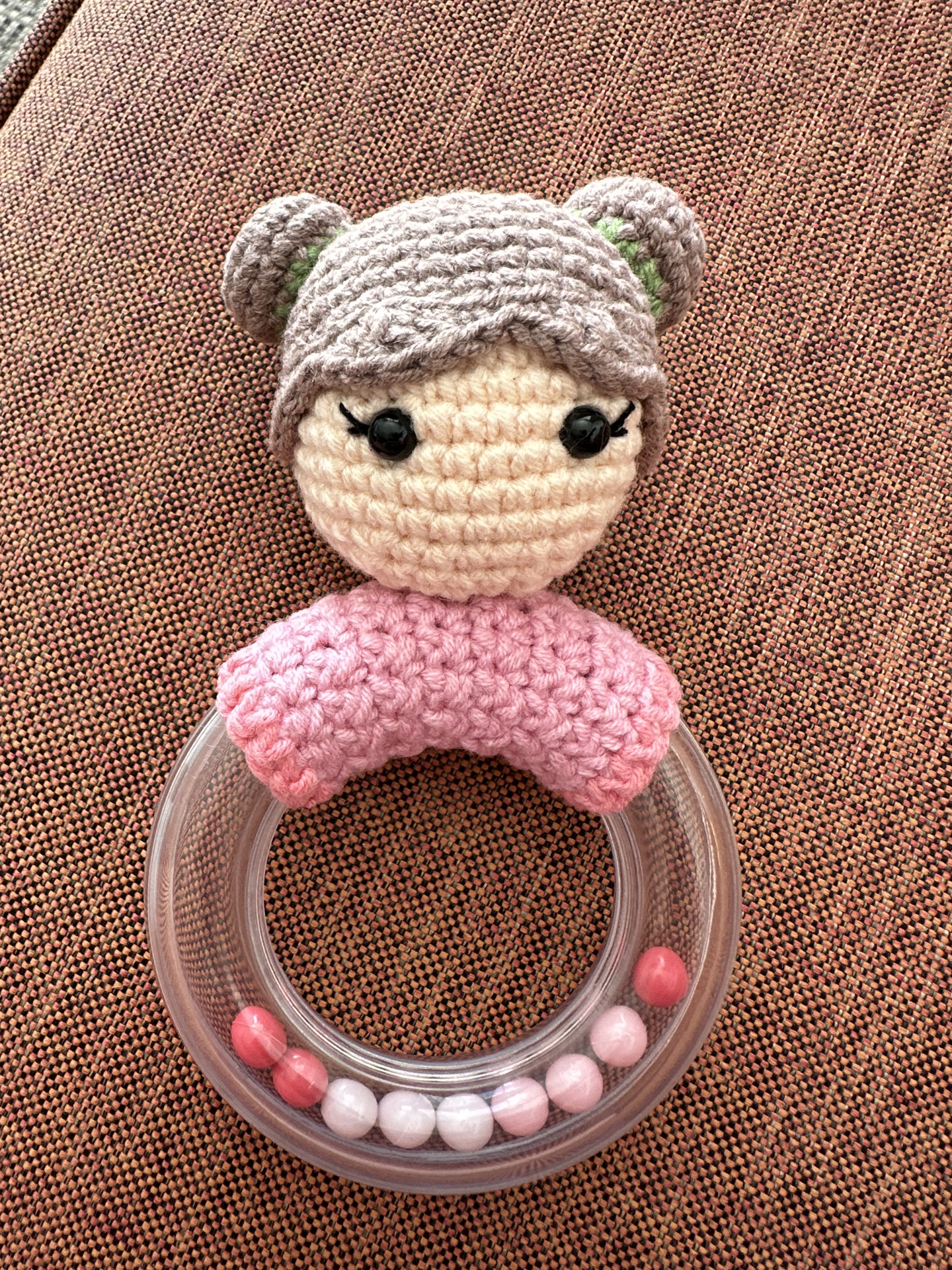 Я запланувала зв’язати під час відпочинку набір для новонародженої донечки начальника Ростика Сьогодні зв’язала брязкальце Carolientje за описом з книги.