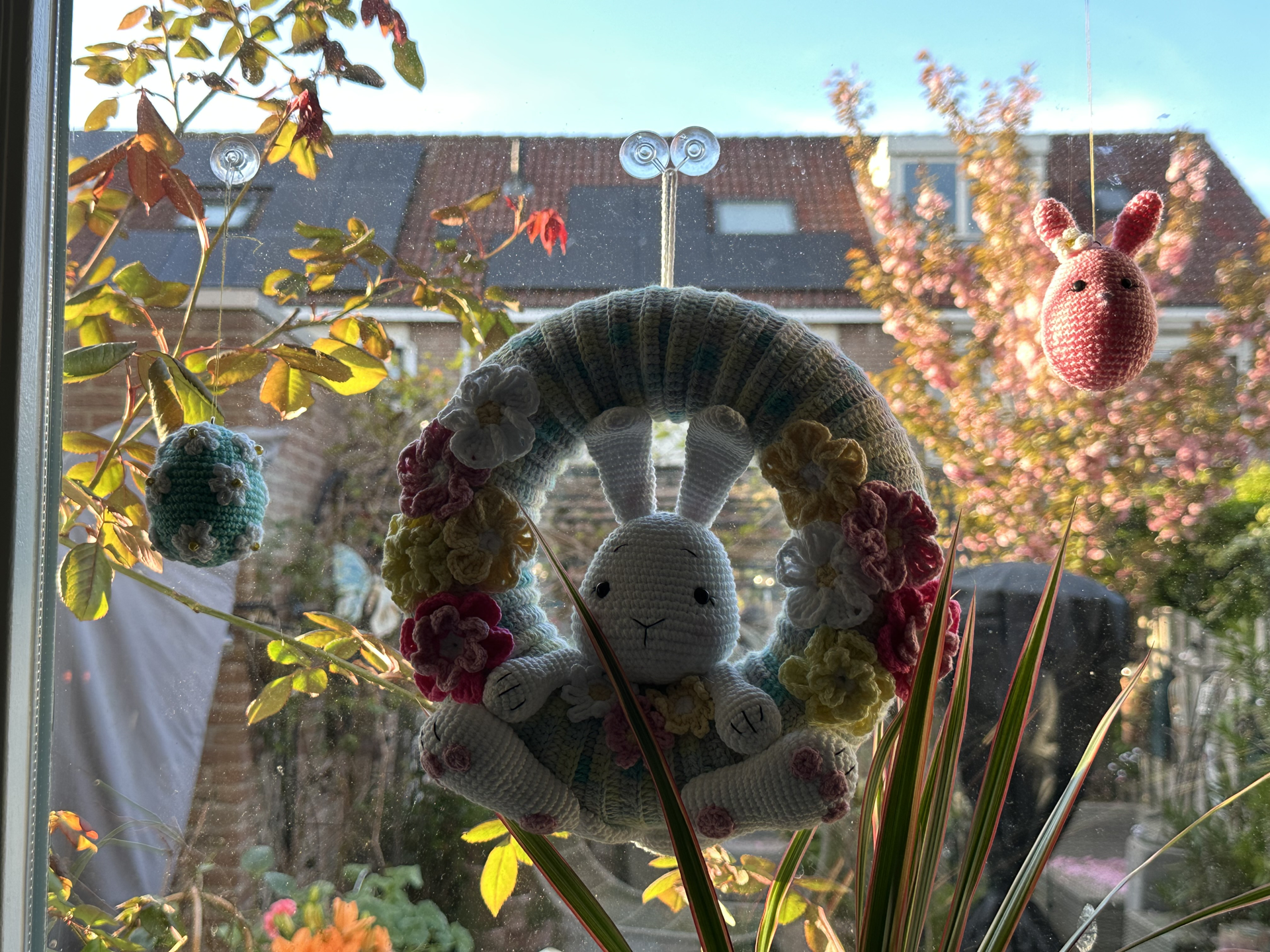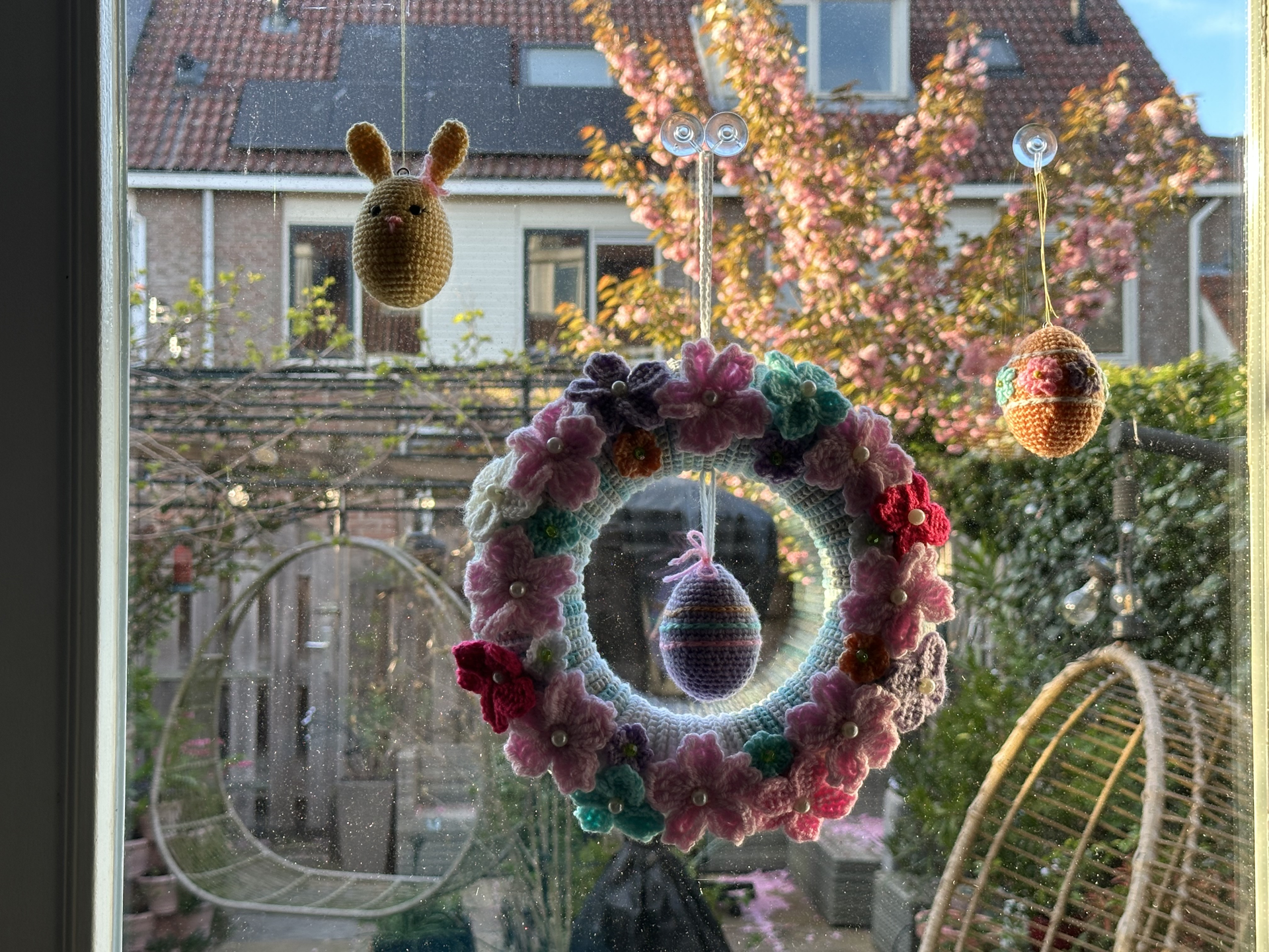 Закінчила другий пасхальний віночок за допомогою зв’язаних Анею квітів.